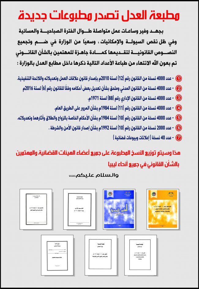 بجهد وفير وساعات وعمل متواصلة طوال الفترة الصباحية والمسائية وفي ظل نقص السيولة والإمكانيات ، وسعياَ من الوزارة في ضم وتجميع النصوص القانونية لتقديمها كمادة جاهزة للمهتمين بالشأن القانوني تم بعون الله الانتهاء من طباعة الأعداد التالية ذكرها داخل مطابع العدل بالوزارة : 1 – عدد 4000 نسخة من القانون رقم (12) لسنة 2010م…