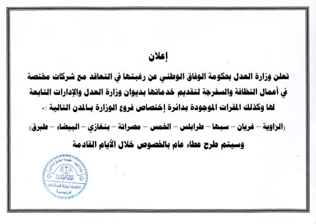 تعلن وزارة العدل بحكومة الوفاق الوطني عن إعادة الإعلان عن العطاء رقم (2) لسنة 2018م