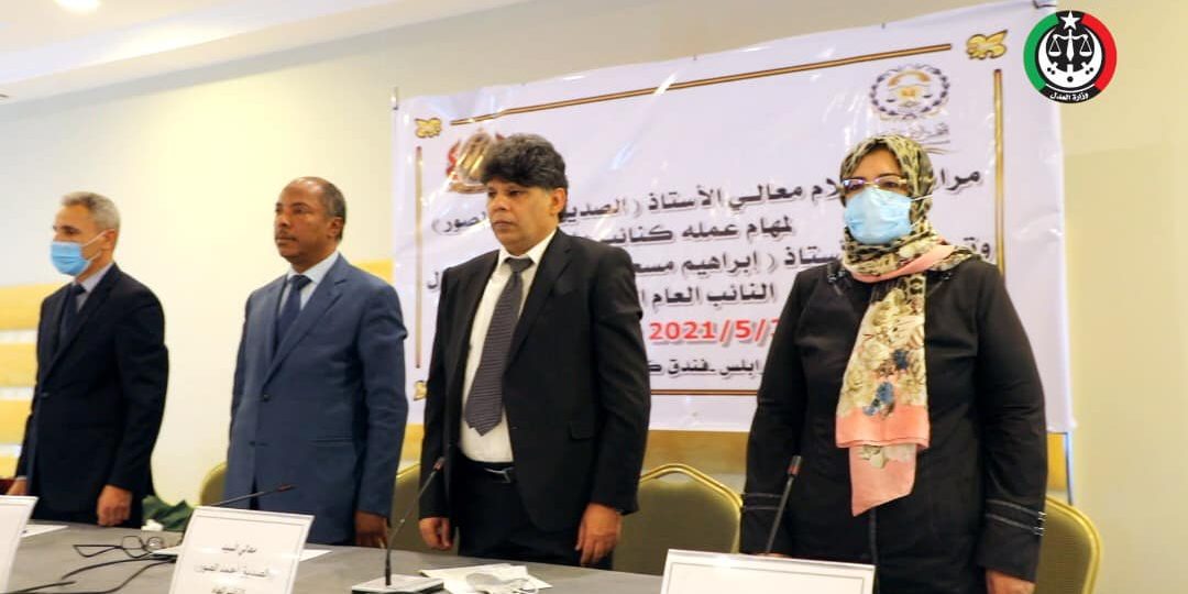حضرت معالي وزيرة العدل “حليمة إبراهيم عبدالرحمن” اليوم الاثنين الموافق 3 من شهر مايو 2021 ، مراسم إستلام النائب العام الأستاذ “الصديق الصور” من سلفه الأستاذ “إبراهيم مسعود” القائم بأعمال النائب العام سابقا، وحضر المناسبة السادة أعضاء المجلس الأعلى للقضاء وعدد من رؤساء وأعضاء النيابات ومدراء الإدارات بالوزارة .