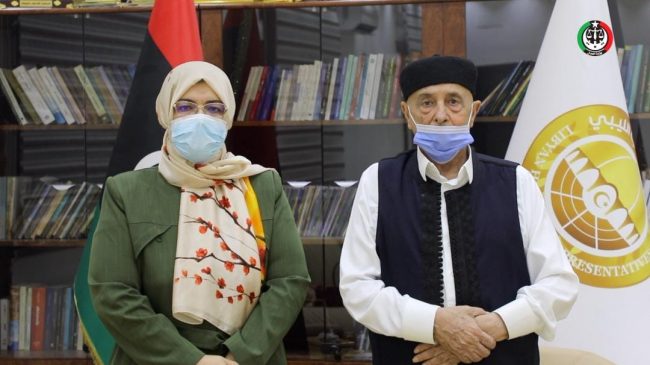 التقت معالي الوزيرة حليمة ابراهيم عبدالرحمن يوم الأربعاء 14 يوليو 2021 فخامة المستشار عقيلة صالح رئيس مجلس النواب، حيث تناول اللقاء مناقشة جملة المواضيع تتعلق بجهود توحيد المؤسسات وتطوير التشريعات والقوانين لبناء #دولة_القانون_والعدل #ودعم_مسار_المصالحة_الوطنية